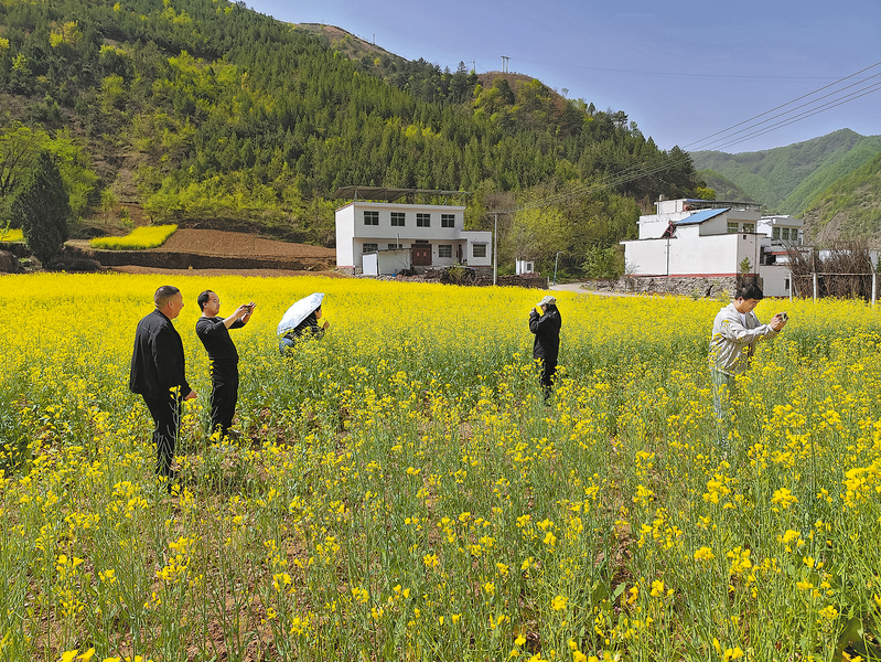 4月10日,游客在丹凤县竹林关镇孤山坪村油菜花海赏花拍照。孤山坪村在市信访局的包扶支持下,通过扶持产业发展,建成临潼石榴产业基地,扩大油菜种植面积,不仅增加了群众收入,还带动了美丽乡村旅游,描绘出村美民富新画卷。(本报记者 贾书章 摄)