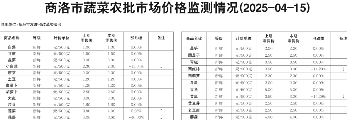 商洛市蔬菜农批市场价格监测情况(2025-04-15)