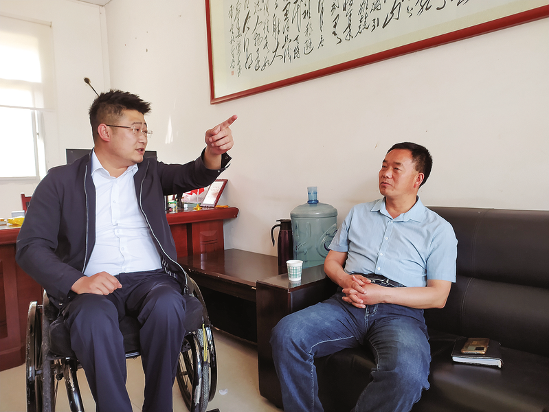 刘方鑫(左)同县残联干部商量“朝阳助残”光伏项目实施办法“我一个残疾人,能经受住人生的苦难煎熬,这要感谢组织、感谢社会、感谢亲人们。是他们无私的关爱,让我成为一个自强的人,重新鼓起勇气,去追求自己的梦想。我希望更多的残疾人和我一样,乐观面对生活,追光而行、向善而行,成就属于自己的事业。”4月11日,在丹凤县花瓶子镇赵湾村的陕西金丰源鸿盛畜牧科技有限公司养兔场,坐在轮椅上的公司法人、残疾青年刘方鑫,看着兔场里一排排蓝色兔舍,面带微笑、坦然地向记者说。