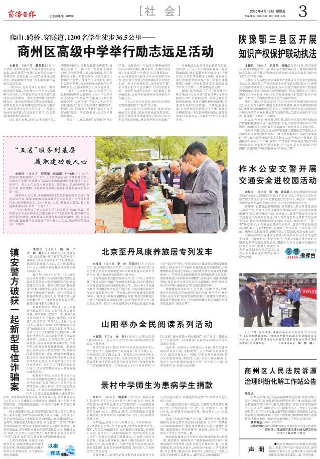 本报讯 (通讯员 董旦旦)4月16日清晨,商州区高级中学操场被晨光染成金色,2027届高一年级1200名学生统一身着校服、背着行囊,开启以“凌峰寻远励壮志,研途踏歌扬青春”为主题的第三届励志远足活动。