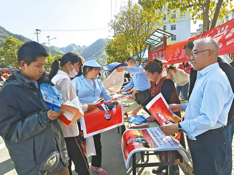 4月14日,丹凤县竹林关镇组织镇村干部开展《国家安全法》《保守国家秘密法》等法律法规集中学习,同时在人口密集区设立咨询台,发放宣传彩页、书籍等资料,进一步增强广大干部群众的国家安全意识和维护国家安全的行动自觉。(本报通讯员 王 蒙 摄)