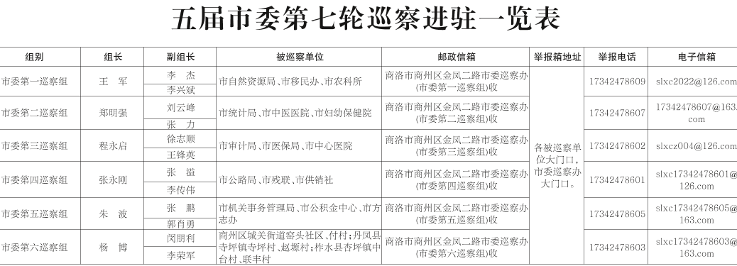 五届市委第七轮巡察进驻一览表