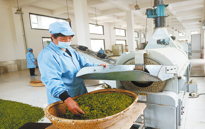 沁园春茶业有限责任公司的加工车间内,机器声轰鸣、茶香四溢,工人正有条不紊地处理着刚刚采摘回来的春茶,经过理条、杀青、烘干等一系列生产步骤,最终制成优质的茶叶。