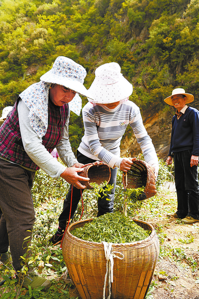 4月16日,柞水县杏坪镇中台村村民在茶园采摘茶叶。