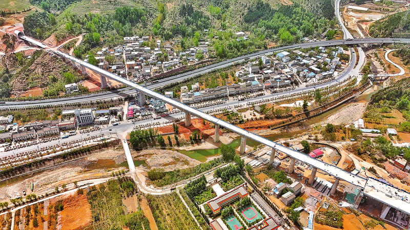 南秦河特大桥是全线唯一一座连跨道(县、省、国道,高速公路)、河的特大桥,存在梁部各类预埋件繁多、钢筋网密集和安全防护要求严及施工难度大等难点,该桥于2025年1月顺利完成桥梁合龙。目前,全体参建者正进行桥梁遮板安装工作。图为4月16日航拍的南秦河特大桥。本报记者 王尚锋 杨鑫