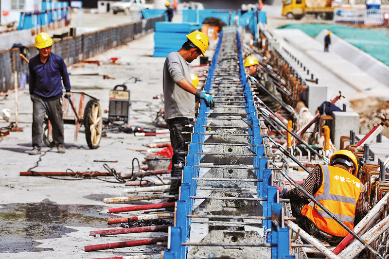 4月16日,工人正在安装刘家河大桥上的防撞墙预制模板。