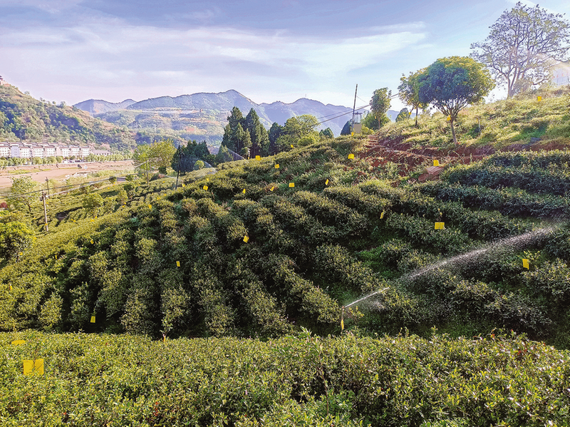 茶园2022年安装了先进的自动化喷灌系统,建成“山脚引水—山腰蓄水池—山顶调节池”三级提水系统,铺设9公里管网,安装2套智能加压设备,利用抽水蓄能引流银花河水进行灌溉。山脚泵站将水抽至300米高的蓄水池后,依托地势落差形成自然水压,精准输送至每片茶园,不仅有效缓解了高温天气对茶叶的影响,还实现了来年茶叶的稳产增产。