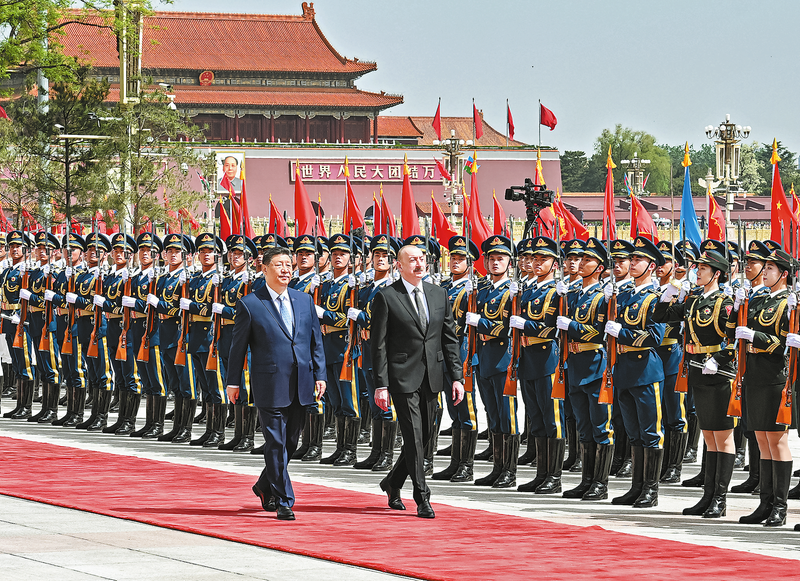 阿利耶夫抵达时,礼兵列队致敬。习近平同阿利耶夫登上检阅台,军乐团奏中阿两国国歌,天安门广场鸣放21响礼炮。阿利耶夫在习近平陪同下检阅中国人民解放军仪仗队,并观看分列式。