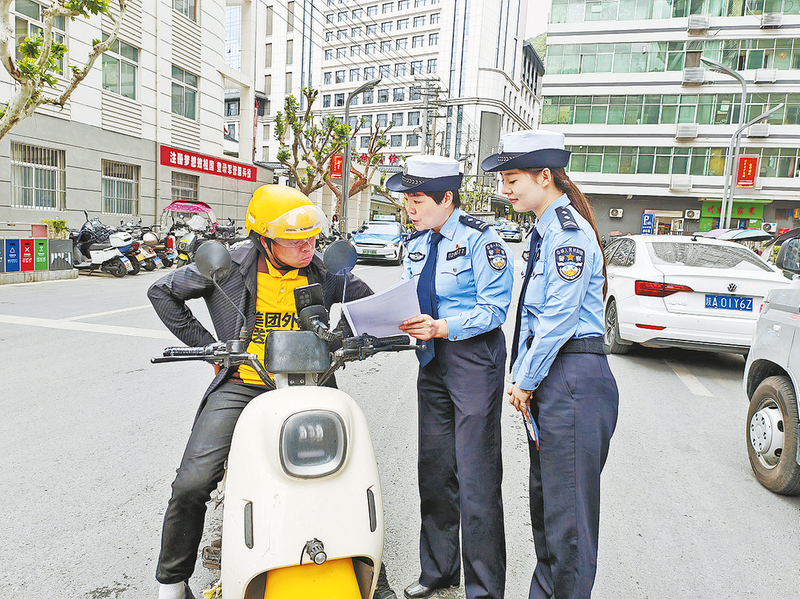 4月21日,镇安县交通民警正在向一名外卖骑手宣传消费品以旧换新政策。为全力落实“两新”政策,推动消费提质升级。近期,镇安县相关部门工作人员通过现场宣讲等形式,向群众宣传消费品以旧换新的补贴标准、申领流程,为群众送上惠民“政策礼包”,助力绿色消费升级。(本报通讯员 宁远鹏 摄)