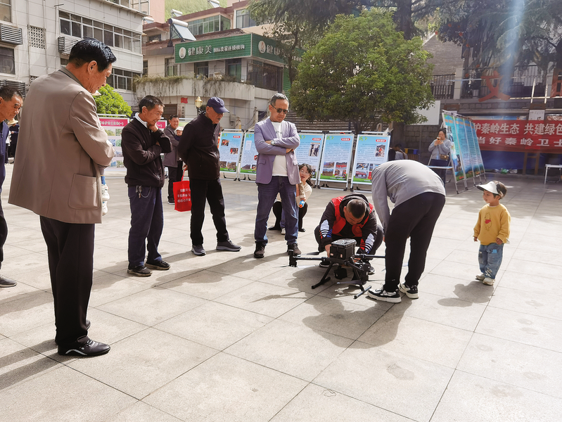 4月22日,柞水县秦岭办等32个行业部门在迎春社区文化广场组织开展“4·20秦岭卫士日”宣传活动。活动现场,工作人员不仅向群众介绍柞水县秦岭生态环境保护工作成果,还为大家展示秦岭监管平台无人机等高科技设备。 (本报通讯员 李 翔 摄)