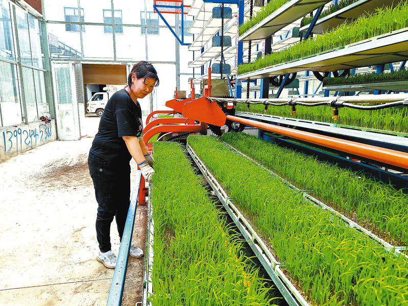 4月27日,镇安县月河镇西川村油菜水稻轮作观光农业基地内,工作人员在查看水稻育苗长势。月河镇西川村大力发展观光农业,春季油菜收割后,300多平方米的温室机械化水稻育苗大棚秧苗长势良好,目前正在加紧平整秧田,为水稻移栽做好准备工作。 (本报通讯员 杨建东 摄)
