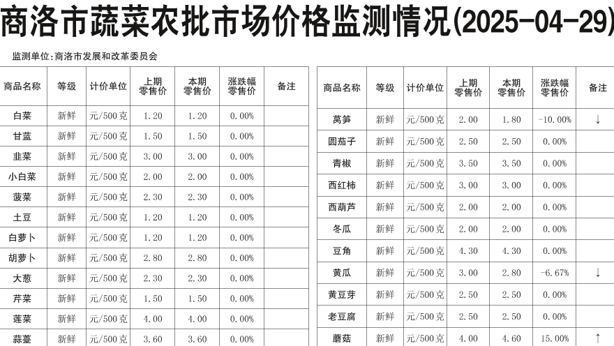 商洛市蔬菜农批市场价格监测情况(2025-04-29)