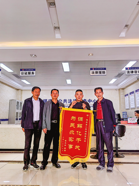 纠纷得以化解,群众为陈新喜(左二)送来锦旗。本报通讯员 辛恒卫