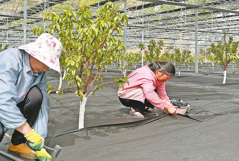 近日,柞水县杏坪镇中台村宁商共建农业产业园内,村民正在为新种植的车厘子树苗做管护。据悉,该产业园项目占地110亩,总投资1800万元,园区规模化种植“布鲁克斯”等10个车厘子品种和“L11”等3个蓝莓品种,带动120名村民就近就业,实现年人均增收9000元。(本报通讯员 汤 昱 摄)