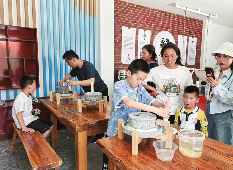 ②“五一”假期,洛南县音乐小镇推出快闪巡游、民谣歌会、玩偶巡游、马戏表演、打铁花及非遗美食体验等丰富多彩的活动。图为游客带孩子体验传统石磨制作工艺的乐趣。 (本报记者 张 英 摄)