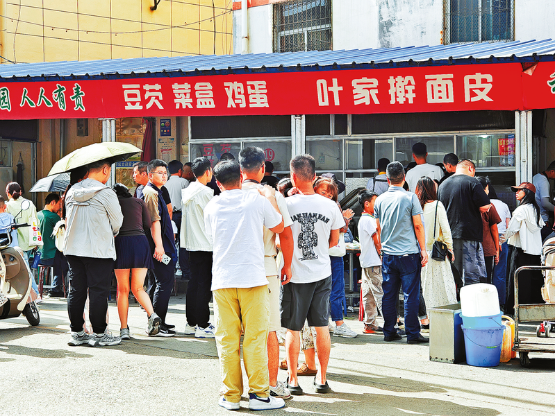④“五一”假期,位于商州区的和平早餐市场因其有着众多商洛地方特色名小吃而吸引了大批游客前来品尝。图为5月3日,和平早餐市场名小吃叶家擀面皮摊位前排起了长队。 (本报记者 杨 鑫 摄)