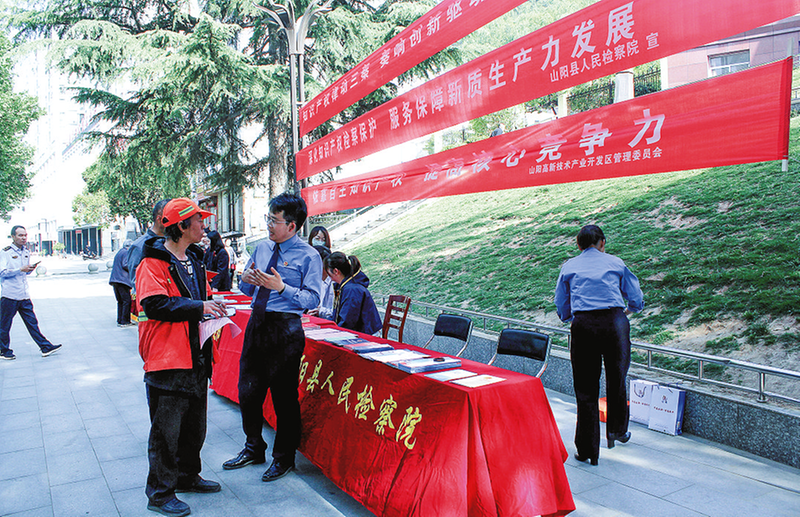 4月25日,山阳县人民检察院开展以“深化知识产权检察保护 服务保障新质生产力发展”为主题的法治宣传活动。活动现场,检察干警通过设置咨询台、悬挂宣传横幅、发放宣传资料等方式,向过往群众广泛宣传知识产权相关法律法规。 (本报通讯员 杨 钊 摄)