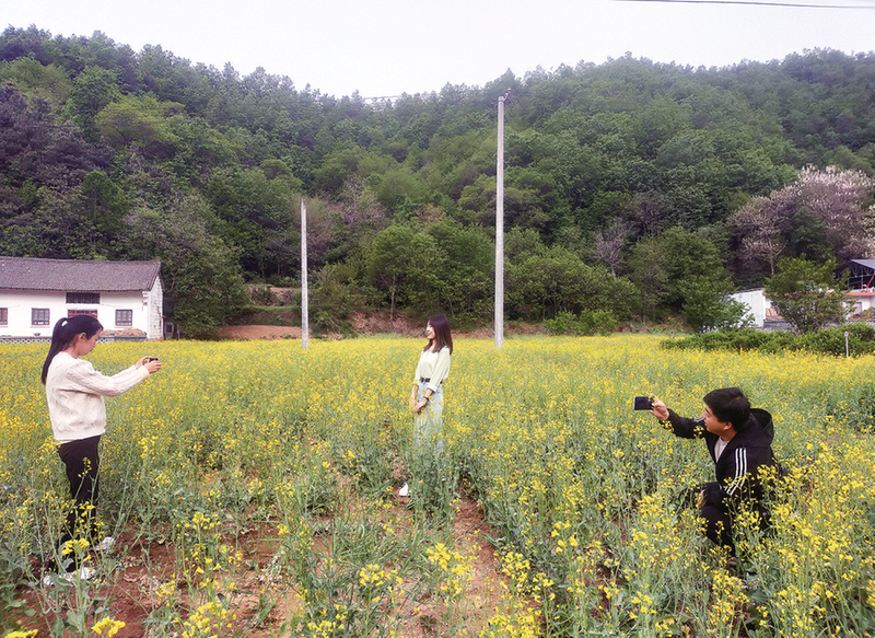 近日,随着气温回暖,商州区北宽坪镇的千亩油菜花竞相绽放,金黄色染尽山野,形成一道亮丽的风景线,吸引周边游客纷至沓来,欣赏美景。图为4月28日,游客赏花拍照,馥郁的花香沁人心脾,让人流连忘返。 (本报通讯员 彭建文 摄)
