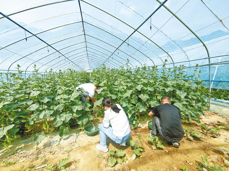 今年以来,每逢周末或节假日,柞水县凤凰镇桃园村生态蔬菜基地迎来不少游客,在农技人员指导下体验蔬果采收的乐趣。图为“五一”期间,来自外地的游客正在将鲜嫩的黄瓜收入竹篮。 (本报通讯员 姜 勇 摄)