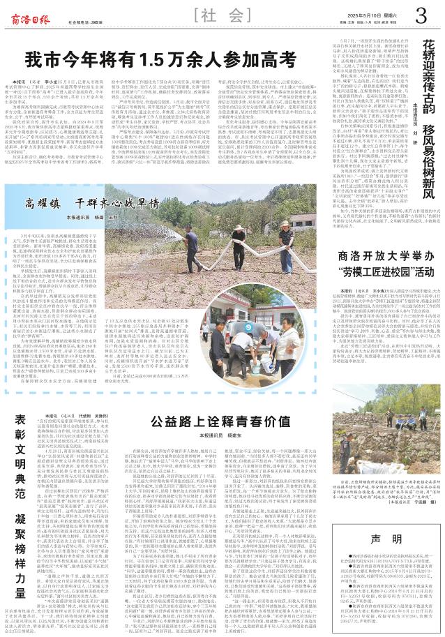 本报讯 (通讯员 代绪刚 吴豫伟)“良好的家风是家庭幸福的根基,参与社区服务则是回馈社会的最好方式。未来我将继续以身作则,带动更多邻里加入志愿者队伍,共同为社区建设贡献力量。”在社区文明典范颁奖仪式上,商南县城关街道富兴社区居民张克武说。