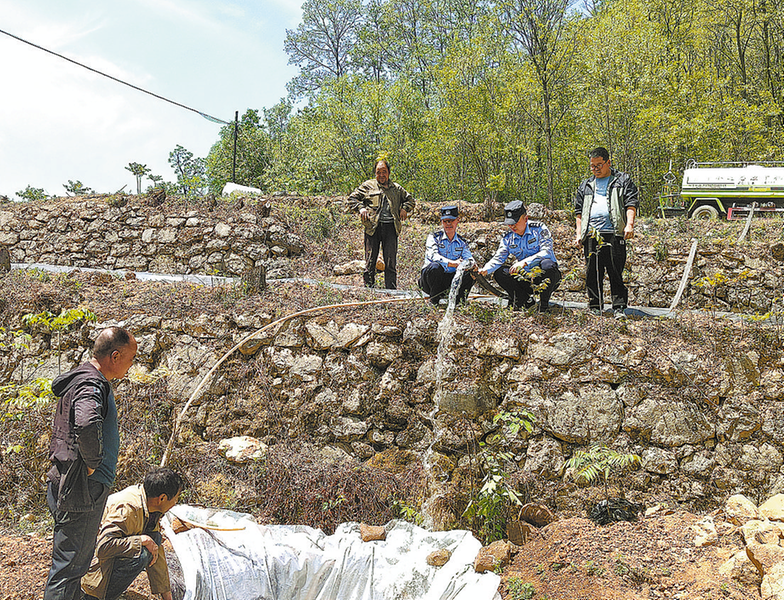 目前,正值烤烟栽种关键期,持续高温少雨导致镇安县茅坪回族镇旱情形势严峻,部分烟田土壤干裂,为此,镇安县公安局茅坪派出所联合镇党委、政府启动“抗旱保苗”行动,用“消防车+洒水车”送“及时雨”到地头,为烟农送去生产“生命线”。(本报通讯员 宁远鹏 摄)