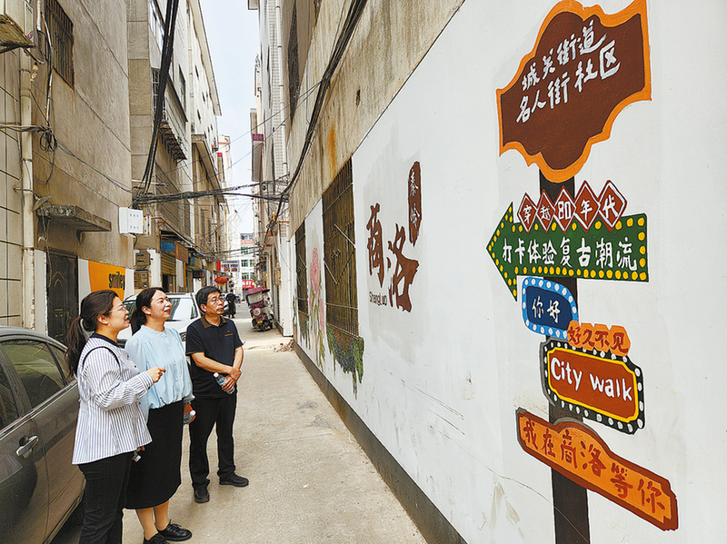 连日来,商州区城关街道名人街社区睦邻巷内的一组组生动活泼的“80年代县城生活”复古墙体绘画吸引了众多的市民和外地游客纷纷前往打卡拍照。据介绍,这是该社区发动积极群众参与,因地制宜,提升城市文明形象,确保城中村整治见实效的有力举措。图为5月14日拍摄的睦邻巷复古绘画墙打卡点。(本报通讯员 张红中 摄)
