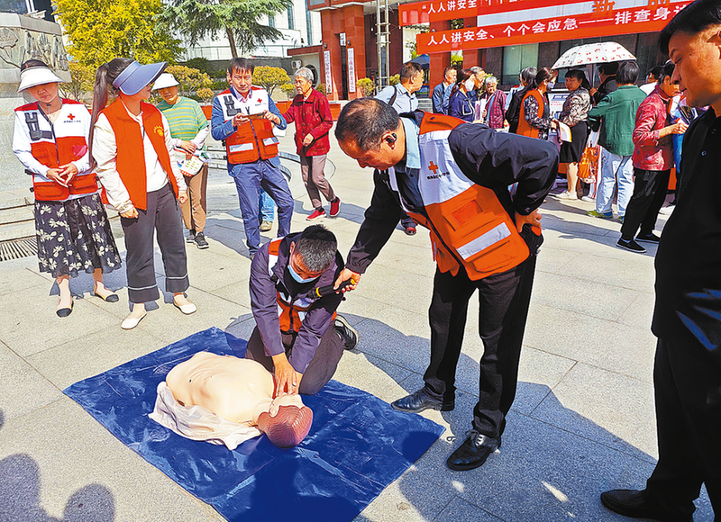 5月12日,商南县气象局携手县应急管理局、消防救援大队、红十字会等安委会成员单位,在县政府人民广场开展“人人讲安全、个个会应急——排查身边灾害隐患”主题集中宣传活动。图为红十字会工作人员现场开展心脏复苏教学。(本报通讯员 程 龙 摄)
