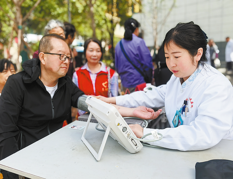 5月9日,商州区城关街道东街社区联合区文化馆、区文保中心、区图书馆等单位,邀请商州区人民医院,在区图书馆门口开展“健康进社区,爱心暖万家”义诊志愿服务活动,为群众提供免费血压血糖检测、内科问诊、现场体验中医诊脉、悬灸拔罐等服务。 (本报记者 胡 蝶 摄)