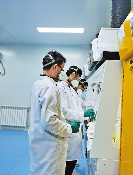 5月9日,商州区氟硅产业园区实验室里,工作人员正在进行氟硅化工新产品科研项目实验。近年来,氟硅化工公司积极开展清洁、低碳、循环的绿色制造体系建设,先后投资1亿多元,实施尾气、污水深度处理,推动企业走出了一条创新驱动、高端引领、绿色发展之路。 (本报记者 马泽平 摄)