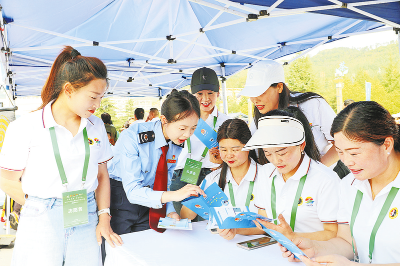 5月15日,2025年全国太极拳公开赛(陕西赛区)在商南县开幕,吸引了省内外千余名选手参赛。在同步举办的农特产品展销会上,国家税务总局商南县税务局组织宣讲队,通过发放资料、现场答疑等方式普及税法知识。 (本报通讯员 韩晓祺 摄)