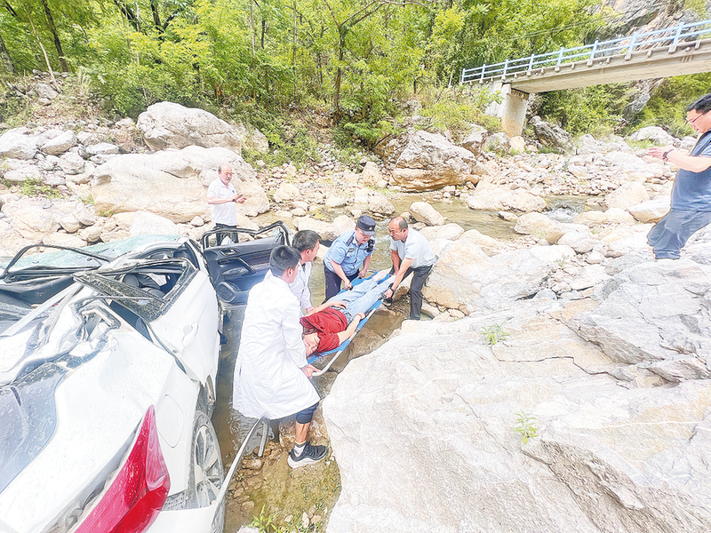 5月14日13时许,镇安县高峰镇两河村一辆轿车意外坠河,当地派出所接警后,值班民警火速赶赴现场,与镇卫生院医护人员展开救援,成功将两名伤者紧急送医救治,受到群众赞扬。 (本报通讯员 宁远鹏 摄)