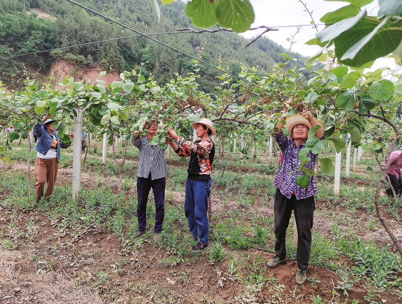 5月15日,务工群众在丹凤县土门镇土门村猕猴桃基地里给猕猴桃掐顶打芽和疏果,为猕猴桃丰产丰收打好基础,务工群众每人每天可收入50至80元。 (本报记者 贾书章 摄)