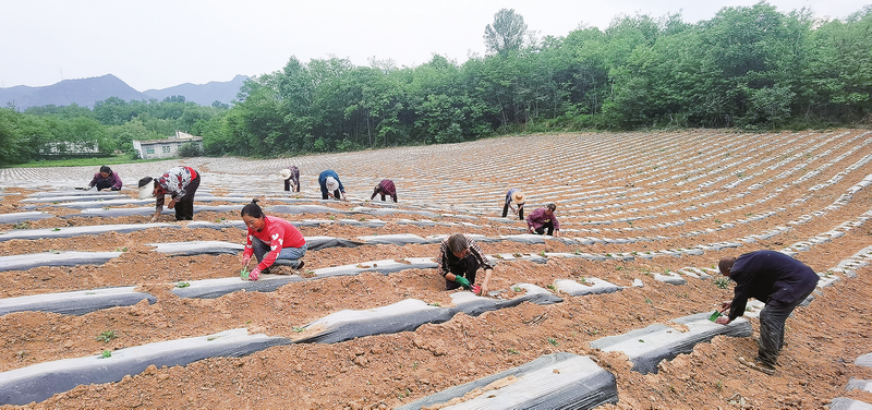 5月16日,务工群众在洛南县保安镇仓圣社区蒿坪岭烤烟大田里为移栽好的烤烟苗覆土。据了解,当地烤烟种植户李向阳、付亚荣等群众有着近10年的烤烟大田移栽经验,今年每户栽植烤烟50亩以上,采用互助合作、邻里相伴、技术指导、规范栽植,大田烤烟移栽即将完工。