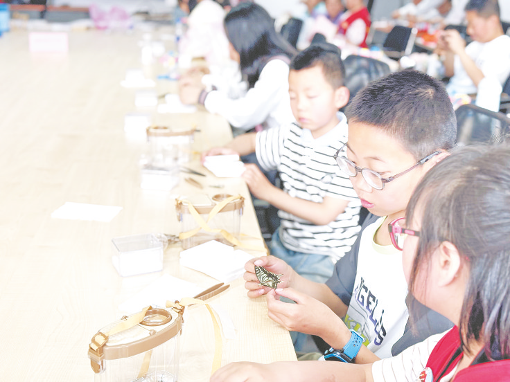 随后,在商洛学院的拾趣标本工坊里,张博一边给小记者发放提前准备好的蝴蝶标本制作材料,一边介绍蝴蝶针插、展翅等标本制作内容。“蝴蝶和其他昆虫常使用针插标本的方式制作,但相较于多数种类,多了展翅的步骤,我们今天主要就是进行展翅,展翅后要多放几天,等翅膀形态固定好后才能移入到展示盒中。”在老师的指导下,小记者们小心翼翼地拿起蝴蝶材料,按照步骤进行操作。“哇,这只蝴蝶好漂亮!就是寿命很短,制作成标本就可以永远留住它的美丽!”一名小记者举着自己制作的蝴蝶标本开心地说。