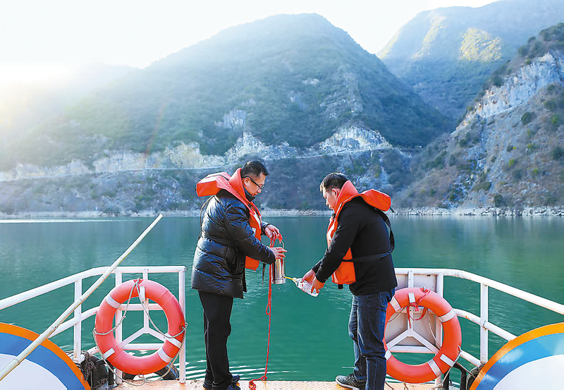 李泉(左)和同事在莲花台水库进行水质采样初夏的商南县莲花台水库,碧波漾轻舟,青山叠鹭影。水库边,商南县生态环境分局副局长李泉和同事小段进行水质采样。河风掀起他笔记本扉页,两行骨力遒劲的字体跃入眼帘——“要像保护眼睛一样保护生态环境……”