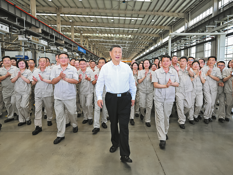 5月19日至20日,中共中央总书记、国家主席、中央军委主席习近平在河南考察。这是19日下午,习近平在洛阳轴承集团股份有限公司智能工厂考察时,同企业职工在一起。 (新华社记者 燕 雁 摄)