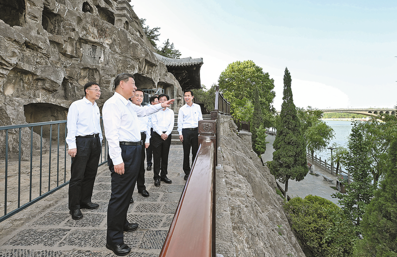 已有1500多年历史的龙门石窟,是重要的世界文化遗产。习近平来到这里,察看石窟整体布局风貌和代表性窟龛、造像,同现场的文物保护工作者亲切交流。他强调,要把这些中华文化瑰宝保护好、传承好、传播好。游客们见到总书记,都十分欣喜,纷纷向总书记问好。习近平不时同大家交流,特别鼓励小朋友们多到实地寻溯中华文化,从小树立文化自信。他指出,文旅融合前景广阔,要推动文旅产业高质量发展,真正打造成为支柱产业、民生产业、幸福产业。