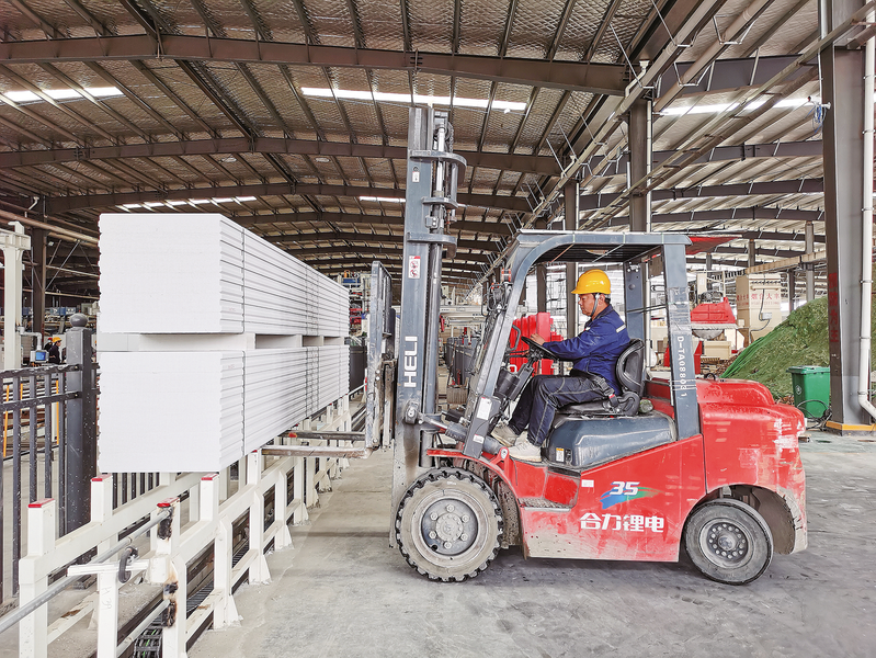 5月14日,位于洛南县城关街道的陕西鑫磊恒达新型建材有限公司车间内,铲车工人正从生产线上卸载石英砂加气混凝土板材。该公司主要利用商洛丰富的尾矿资源,生产新型环保墙体材料,将尾矿“变废为宝”,可年利用尾矿50万吨,生产墙体材料100万立方米,可实现产值2.3亿元,目前已初步形成以关中为核心,辐射甘肃、山西、河南等地的销售网络。 (本报记者 马泽平 摄)