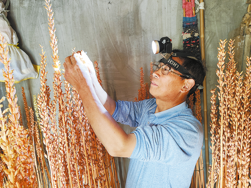 种植大户周中启在为天麻进行人工授粉“这个时节正是天麻授粉的关键期,在把握好温度和湿度的情况下,工作做得越精细,天麻育种就越好,产出就越高。”5月15日,蒙蒙细雨里,在丹凤县土门镇龙王庙村囫院组,记者走进天麻种植大户周中启的天麻育种房里,只见他戴着头灯,右手捏着一个小小的竹签,左手轻拢天麻花,将花里细如面粉的花粉轻轻拨入另一朵天麻花里,这个微小的动作他要重复多次,直到将一枝天麻上的花全部授粉完结,又接着给另一枝天麻花授粉。最忙时,他和老伴两个人忙不过来,就请来亲戚和邻居帮忙,要赶在天麻最佳授粉期把人工授粉的活儿干完。