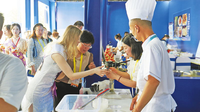 中午时分,陕菜美食文化交流区香气四溢,商洛的“味觉密码”在此揭晓。在第九届丝博会陕菜美食文化交流活动期间,我市设立330平方米的美食展区,来自洛南县民生食品科技开发有限责任公司、商洛市国际会议中心、金悦福酒店、佑青山小院等14家优质餐饮企业的工作人员在现场制作商州菌菇小火锅、洛南豆腐、丹凤牛筋面、核桃饼等地方特色小吃,供游客品尝、购买,集中展示商洛秦岭山珍特色餐饮。