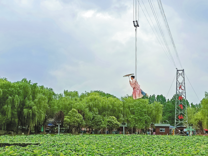 端午假期,丹凤县棣花景区树木葱茏,荷叶田田,游人如织。有的观赏荷塘美景,有的挥桨划船,有的体验“空中飞人”的刺激,清凉又浪漫。 (本报通讯员 彭 涛 摄)