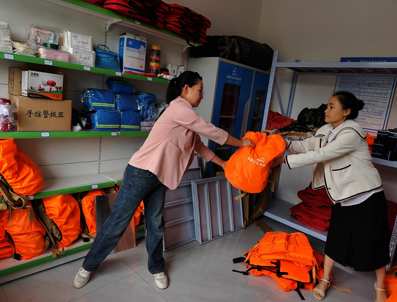 5月30日,丹凤县铁峪铺镇桃花村工作人员正在储备防汛抢险物资。该村在包扶单位省应急管理厅驻村工作队的支持下,未雨绸缪,提前调运回一批救生衣、手摇式报警器、充电手电、应急电喇叭、塑料编织袋等防汛应急物资,为安全度汛做好物资保障。(本报记者 贾书章 摄)