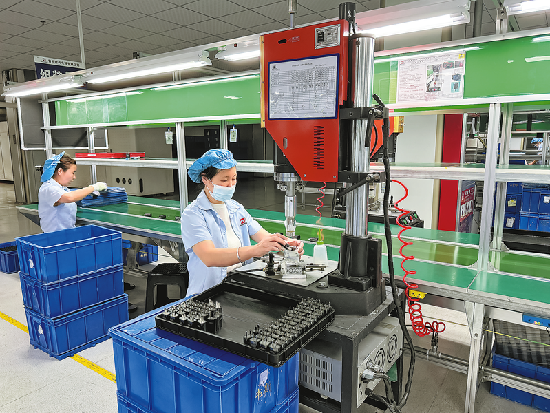 6月4日,位于山阳县电子信息产业园的陕西迈思普电器有限公司生产车间内,工人正井然有序地在生产线上忙碌。据了解,山阳县迈思普电子信息产业项目是从东莞引进的延链强链项目,总投资5.5亿元,建设工业及消费电源生产线62条,60%的产品出口欧美、日韩等地,带动就业800多人。 (本报记者 王天彤 摄)