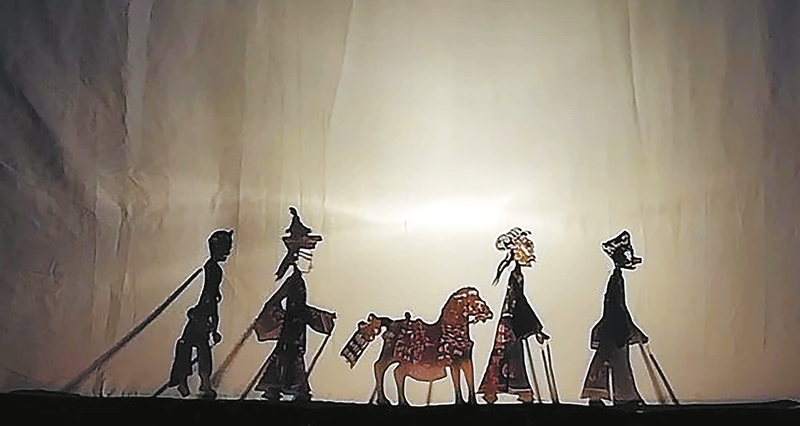 皮影戏展演灯光熄灭,白色幕布亮起,在观众掌声中,一场商州皮影戏拉开帷幕。幕布上,精致小巧的平面影人跟随着剧情发展变换出不同的姿态和动作;幕布后,一个耍签子的老人在灯光下用手操控着几个不同的皮影偶人。