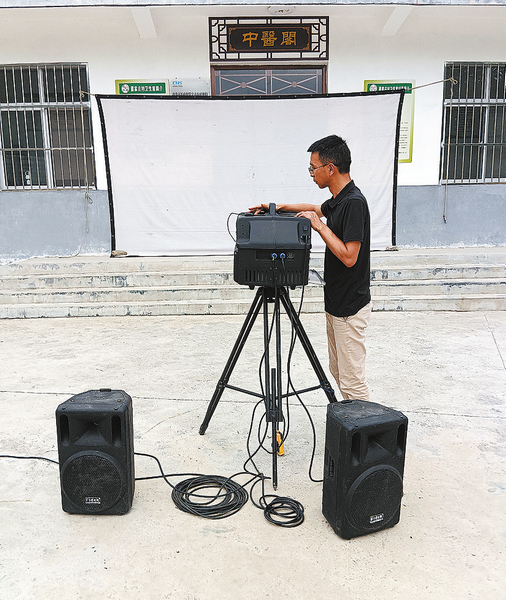 6月3日傍晚,封修斌早早来到高坝店镇蔡家庄村村委会广场进行电影设备调试。5月28日深夜,山阳县天竺山镇三槐村文化广场,最后一个镜头播完,银幕上的光影渐渐暗下去,广场上的热闹劲儿也跟着散了。山风卷起幕布的一角,拂过封修斌略显黝黑的脸庞,他借着手机电筒的光,熟练地收起三脚架,嘴里念叨着:“得赶紧收拾,明早还得去高坝店镇。”