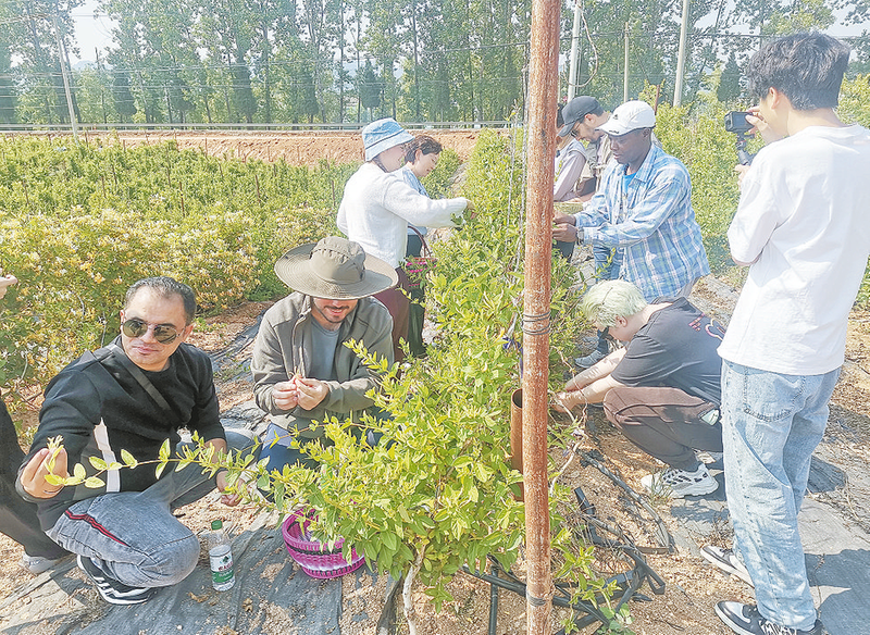 5月29日,商洛学院组织10余名外籍专家教授,走进洛南县景村镇御史村现代农业园区,参观四为书院、家风家训馆、农耕民居馆,探访乡村百岁老人,并深入该村宏泰金银花专业合作社的金银花基地大田和工厂,考察、调研、体验金银花的采摘、生产加工流程与技术工艺。 (本报通讯员 郭夏季 摄)