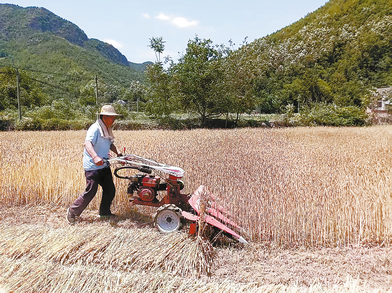 本报讯 (通讯员 彭建文)6月6日,村民在商州区北宽坪镇刘院村用小型小麦收割机收割小麦。