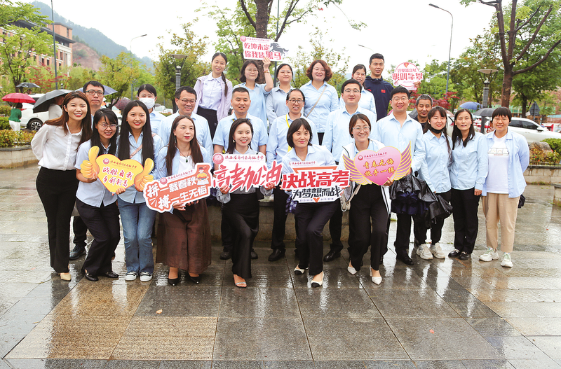 6月7日,商州区高级中学28名教师手举励志手牌,在考点入口道路旁为每位考生加油鼓劲。