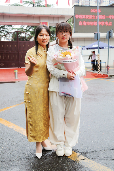 ◁6月7日,考生家长刘煜婷身着金黄色旗袍,手捧鲜花接女儿走出考场。