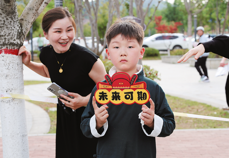 6月8日,商洛中学考点处一位小朋友为姐姐送上特别的祝福。